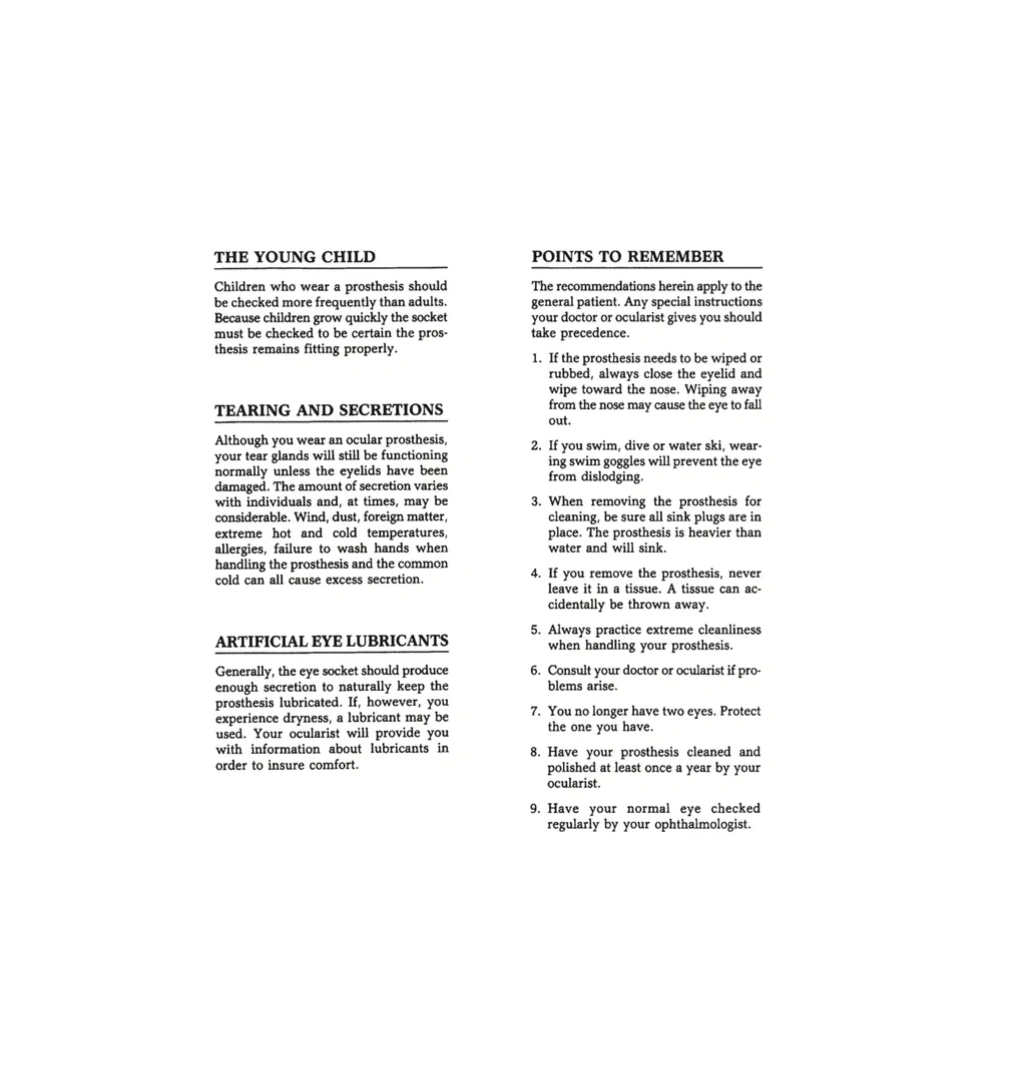 The prosthesis should be professionally cleaned at least once a year to remove protein build-up. The socket and prosthesis should also be checked to insure a proper fit and cosmetic result.